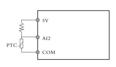 Ai2可接受电机温度传感器输入,当电机温度超过保护值时,变频器输出故障并停机。